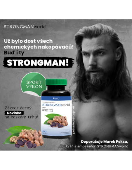 Originál obsahující byliny a plodiny pěstované na plantážích v jižní Asii, v současnosti dostupný pouze u nás! 100% garance kvality. Nejvýše zastoupenými složkami STRONGMANworld jsou Kaempferia Parviflora, Astragalus membranaceus a Panax ginseng. Hlavní složka Kaempferia Parviflora (Zázvor černý) je přirozeným antioxidantem. Astragalus membranaceus (Kozinec blanitý) výrazně podporuje imunitní systém, normální činnost cévní soustavy, ledvin a močového měchýře, přispívá ke zvýšení pohyblivosti kloubů a pomáhá normalizovat hladinu cukru v krvi. Panax ginseng (Ženšen pravý) působí příznivě při fyzickém výkonu. Přispívá ke snížení únavy, normální funkci kardiovaskulárního systému a udržuje sexuální zdraví, vitalitu a paměť.